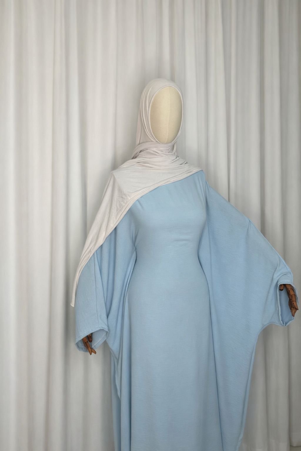 Abaya elegante në ngjyrë baby blue – e lehtë, e rrjedhshme dhe perfekte për përditshmëri apo raste të veçanta.