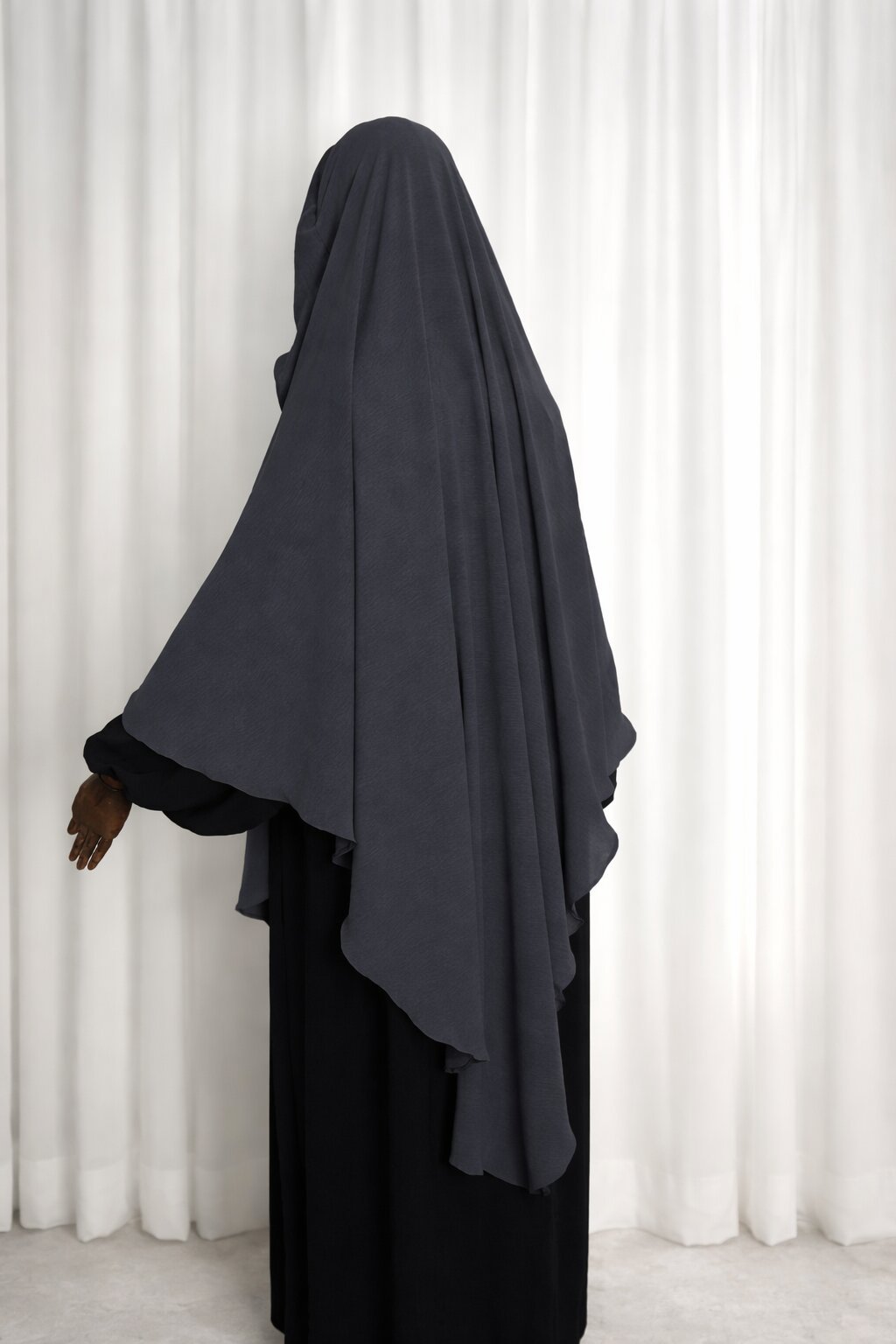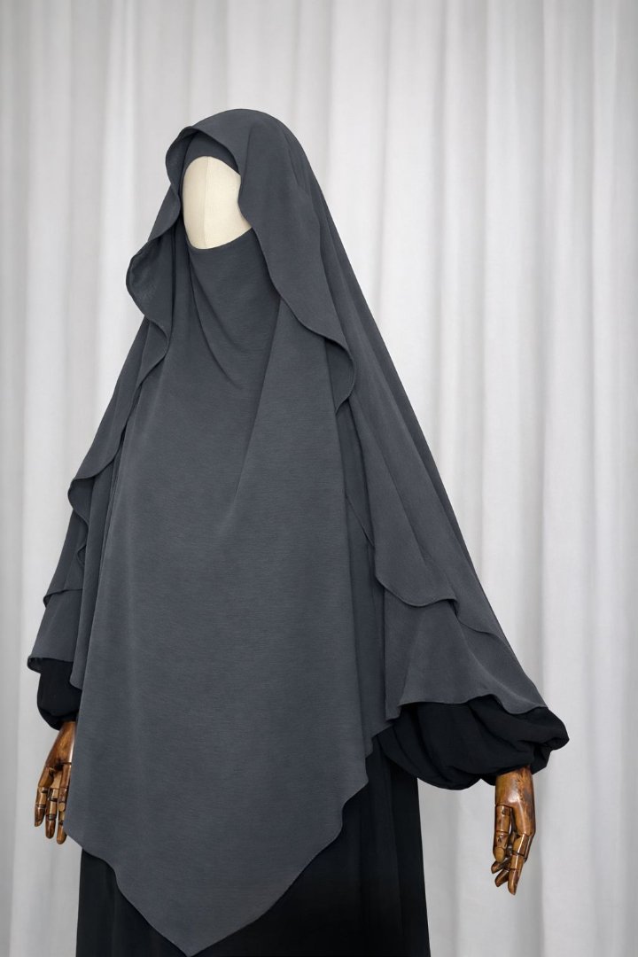 Khimar me prerje elegante “flow” nga materiali Aerobin – i lehtë, i ajrosshëm dhe me rënie perfekte për një pamje të pastër dhe modeste.