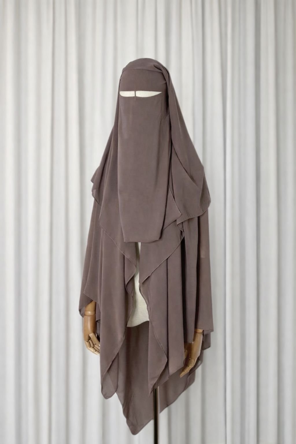 Nikab 3 pjesësh me mbulim të plotë, dizajn të rrjedhshëm dhe shtresa të lehta për rehati dhe stabilitet maksimal.